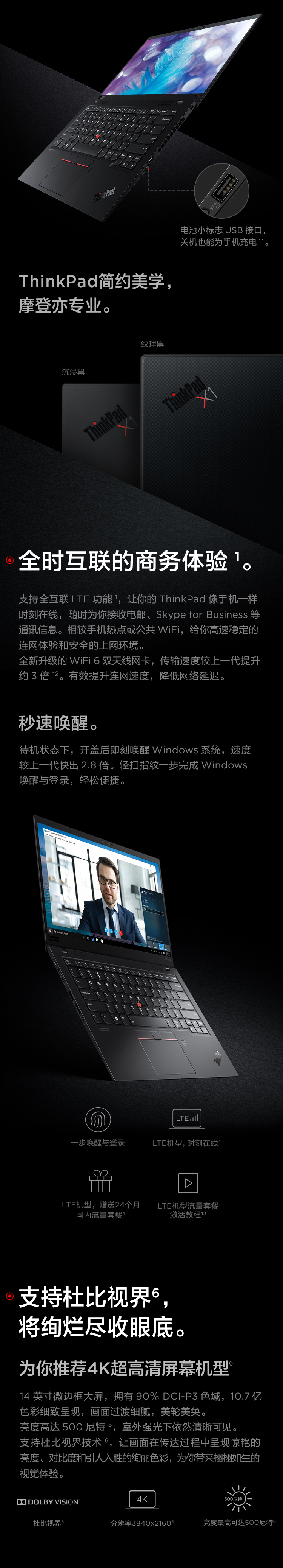 联想ThinkPad X1 Carbon 2020 7FCD 英特尔酷睿i5 14英寸轻薄笔记本电脑 十代i5 16G 512G 4G版 沉浸黑